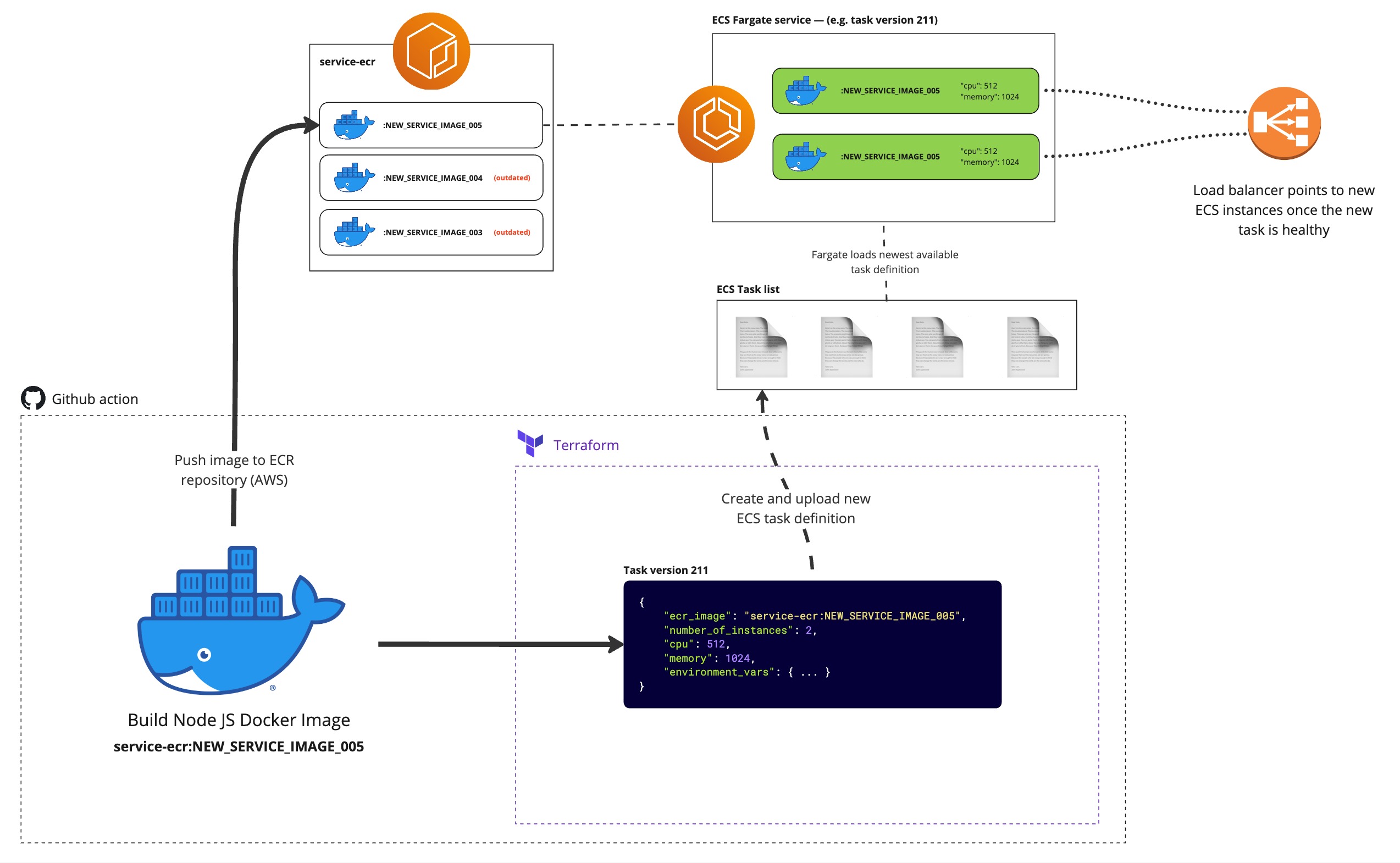 Firstly, an ECR repository is provisioned with terraform (ecr.tf). An ECR repo is just a directory which holds tagged docker images. The Docker image is then built and pushed to the ECR for later use. Afterwards, the rest of the terraform infrastructure if provisioned (load balancer, ECS, security groups, etc) and a new ECS task is created, which references the just-uploaded Docker image. The ECS the spins up the docker image as a Fargate task with the given parameters (and environment variables) specified in the task definition.